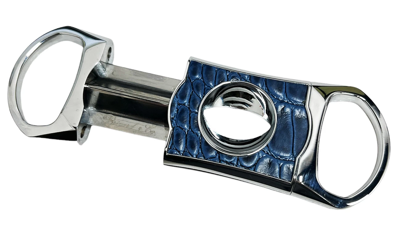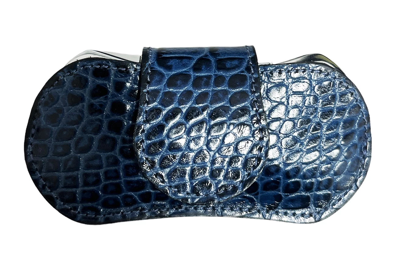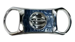 Stainless steel V cutter with crocodile indigo blue finish, comes with a matching crocodile indigo blue button snap pouch