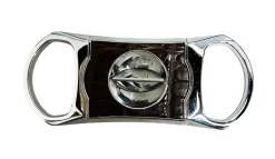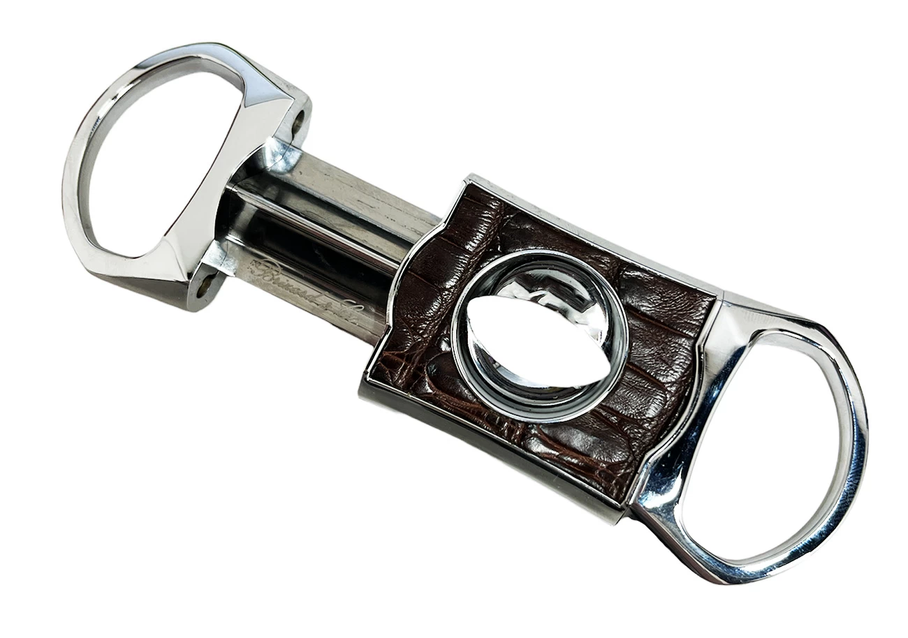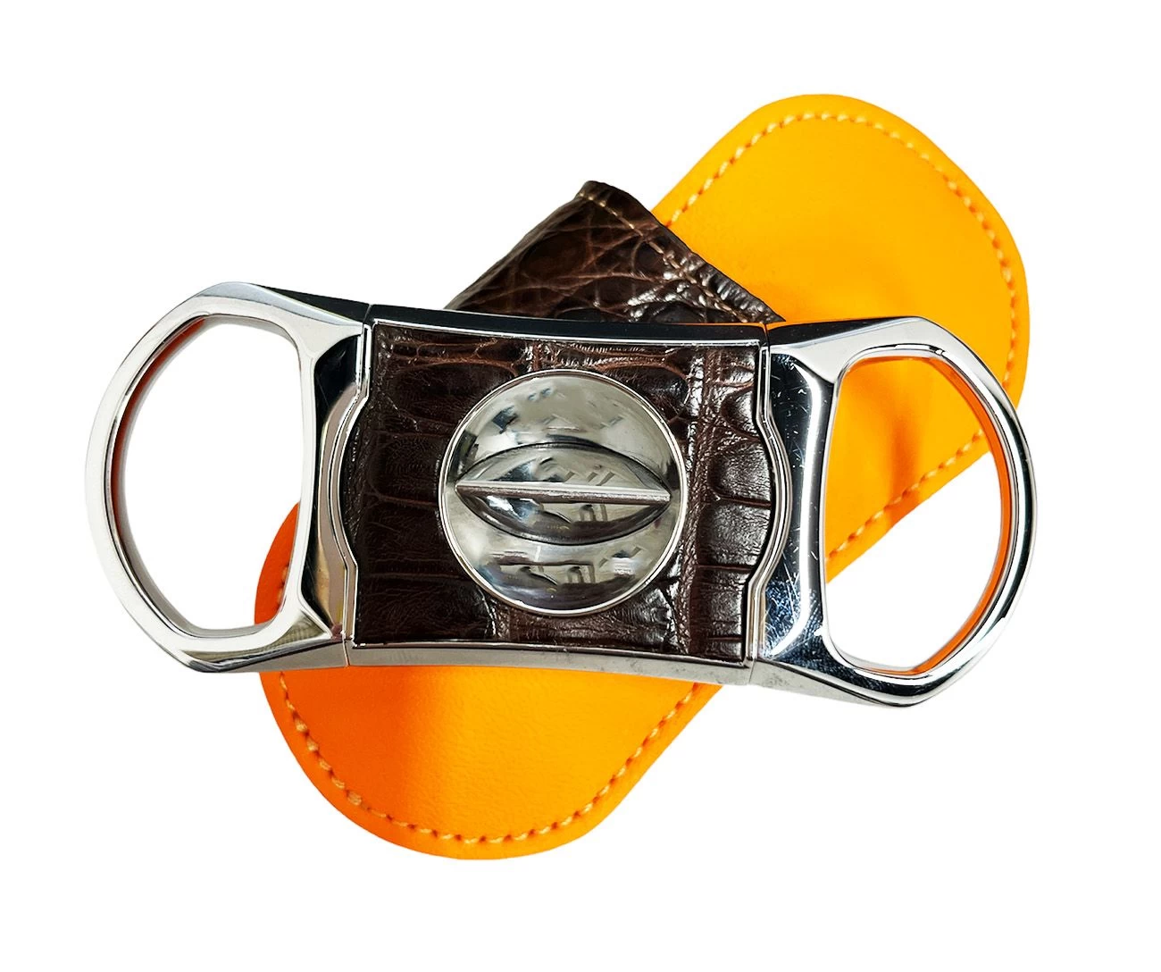 Stainless steel V cutter with genuine caiman tobacco and racing orange finish, comes with a matching genuine caiman tobacco and racing orange button snap pouch