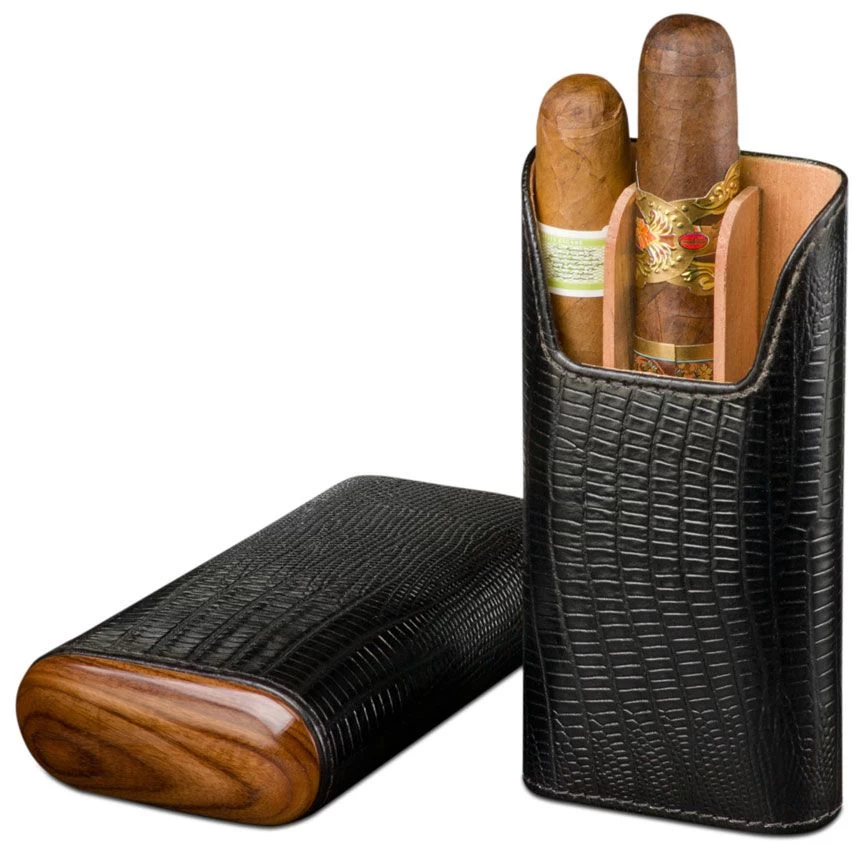 Brizard Lizard Pattern Black Leather & Rosewood Cigar Case – Made In USA
