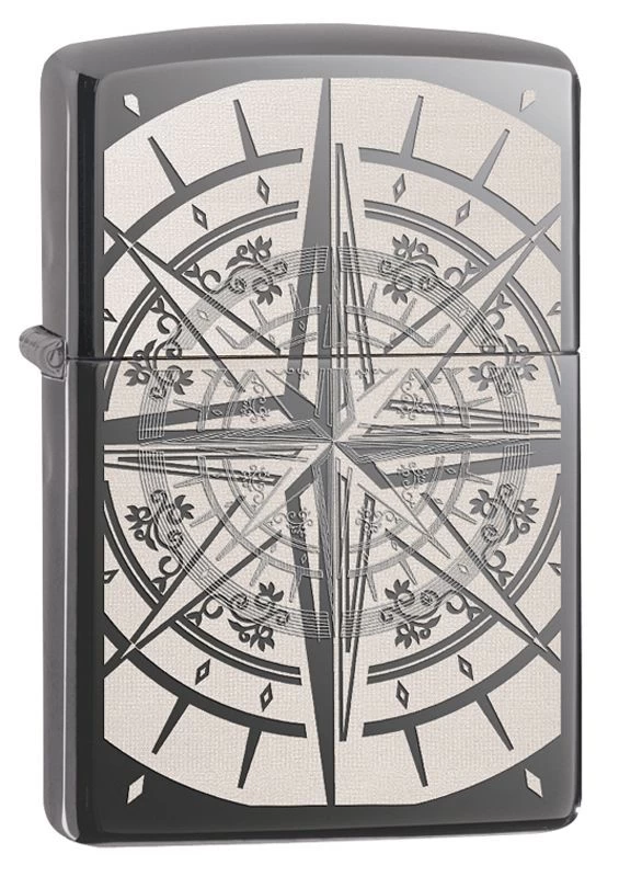 Find your way to an incredible light with this Zippo! The black ice finish creates a dark mirror-like effect that provides the ideal background. The antique compass design has been laser engraved into the surface and doesn’t compromise the durability of the lighter. A single windproof flame is all you need after summoning it with the flint ignition.