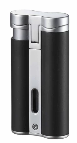 The Matte Black Selter Flower Torch Flame Lighter comes in a unique design. The dual cylinder shaped lighter produces a flower shaped flame, creating a unique and distinct light each and every time. A flip of the cap and you reveal the flame and ignition button. On the back is a large fuel viewing window, and found on the bottom is a large flame adjuster and butane refill location. Matte Black Metal Body with Brushed Chrome Accents Single Wind-Resistant Flower Torch Flame Lighter; Fuel Level Gauge on Back Dimensions: Length: 2.5 Inches, Width: 1.5 Inches, Height: 0.3 Inches; Weight: 3 Ounces Dual Action Ignition; Flip Cap and Push Down Trigger Flame Adjuster and Butane Refill Both Located at the Bottom