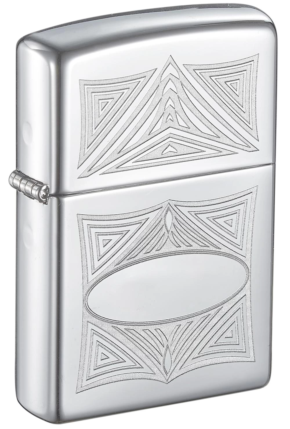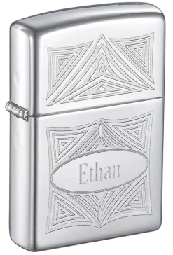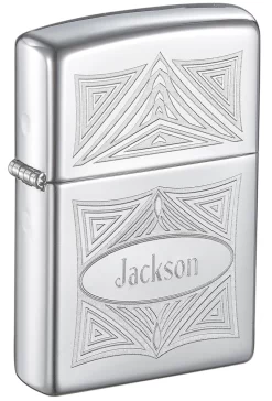 A unique design with a personal touch, other lighters don’t compare to this one-of-a-kind Zippo! Polished chrome is the perfect backdrop to this interesting 3D-like pattern with space for your name or initials. Easily refillable, this Zippo always delivers a windproof flame to light things up and conveniently fits in any pocket! Abstract Design Engraved; High Polish Chrome Finish Distintive Zippo Click; Wind-proof Flame; Made in the USA Approx. Dimensions: (L) 2.25 in x (W) 1.5 in x (H) 0.5 in Solid Brass Metal Body; Flint Ignition System Refillable; Recommended Use of Zippo Premium Lighter Fluid; Ships Empty of Fuel