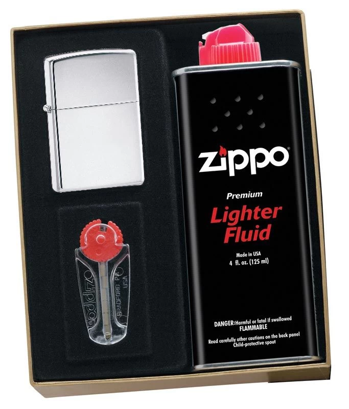 A brilliant lighter ready to ignite a windproof flame you can use in just about any weather condition is found in this Zippo gift kit. Also included is a can of lighter fluid and a flint dispenser that is sure to come in handy for anyone looking to use their lighter right out of the box. Further adding to the appeal of this set is the free engraving we offer for the lighter! You can add up to line to your lighter at no extra charge for a personal look everyone will admire.