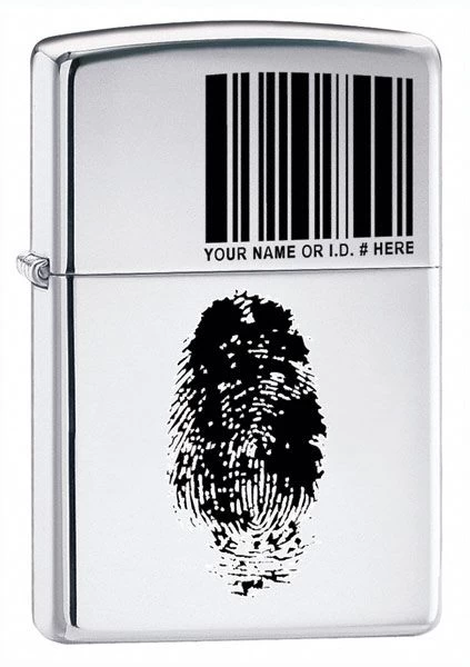 Don’t lose your individuality with boring and characterless lighters, but find it with this Zippo lighter instead. Expressive and amusing, you will be able to identify with the design of this lighter. In fact the clever design consists of two indentifying elements on its polished finish: a fingerprint and a barcode. You can further personalize your lighter with a free engraving on its back. Made in America using windproof technology, this lighter will always provide you with a reliable flame no matter how windy it may get. The durable metal body will live up to Zippo’s famous lifetime warranty. You will love the dependability and easy maintenance of this lighter. Approximate Dimensions: Height : 2.24 inches Width : 1.52 inches Thickness : 0.52 inch Approximate Weight: 1.94 oz Flint Lighter High Polish Chrome Windproof Made in the USA Uses lighter fluid If you would like your Zippo lighter to become a torch flame lighter, we recommend you buy a Z-Plus Zippo lighter insert.