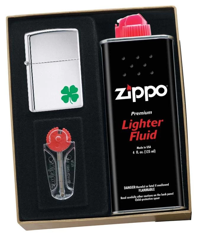 A great addition to any smoker’s accessories, this popular Zippo lighter now comes in gift set for your convenience. With a canister of lighter fluid and a flint dispenser included, this set allows you to use the lighter right out of the box. This windproof lighter was made in the USA and features a lifetime warranty from Zippo. Its polished chrome body features a green clover on its front. Add to this design by customizing your lighter with up to one line of free engraving when you order from eLighters!